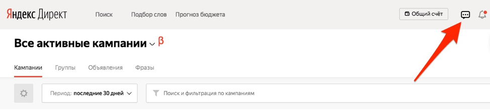 Оставить отзыв можно по-прежнему в правом верхнем углу экрана в интерфейсе Директа: