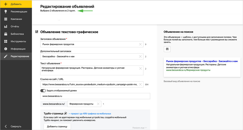 Редактировать текстово-графические объявления в новом окне быстрее и удобнее.