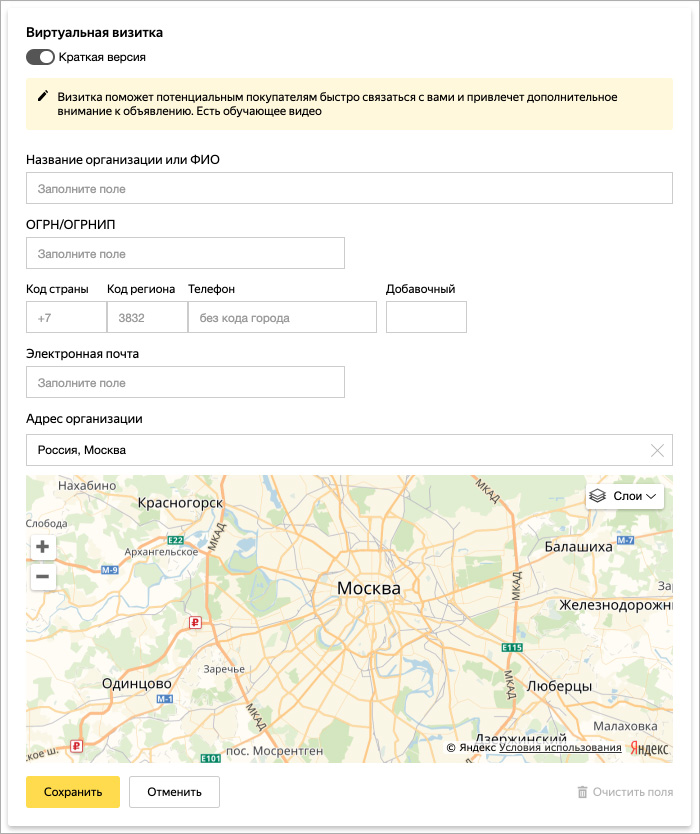 Теперь вы можете выбрать, какую версию электронной визитки заполнять — полную или краткую. В краткой версии можно пропустить некоторые неактуальные поля, например, про офис и часы его работы, если офиса у компании нет. Если все поля в полной версии визитки актуальны, рекомендуем вам заполнить их для большей эффективности.