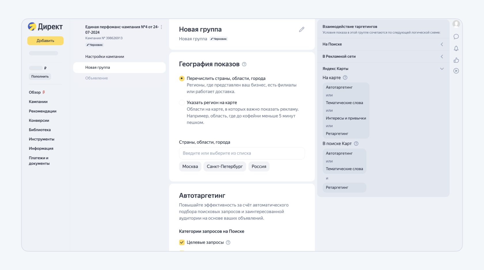 6. На уровне настройки групп объявлений в разделе «Автотаргетинг» теперь отображаются таргетинг и условия показа не только в Поиске и РСЯ, но и в Картах и в поиске Карт.