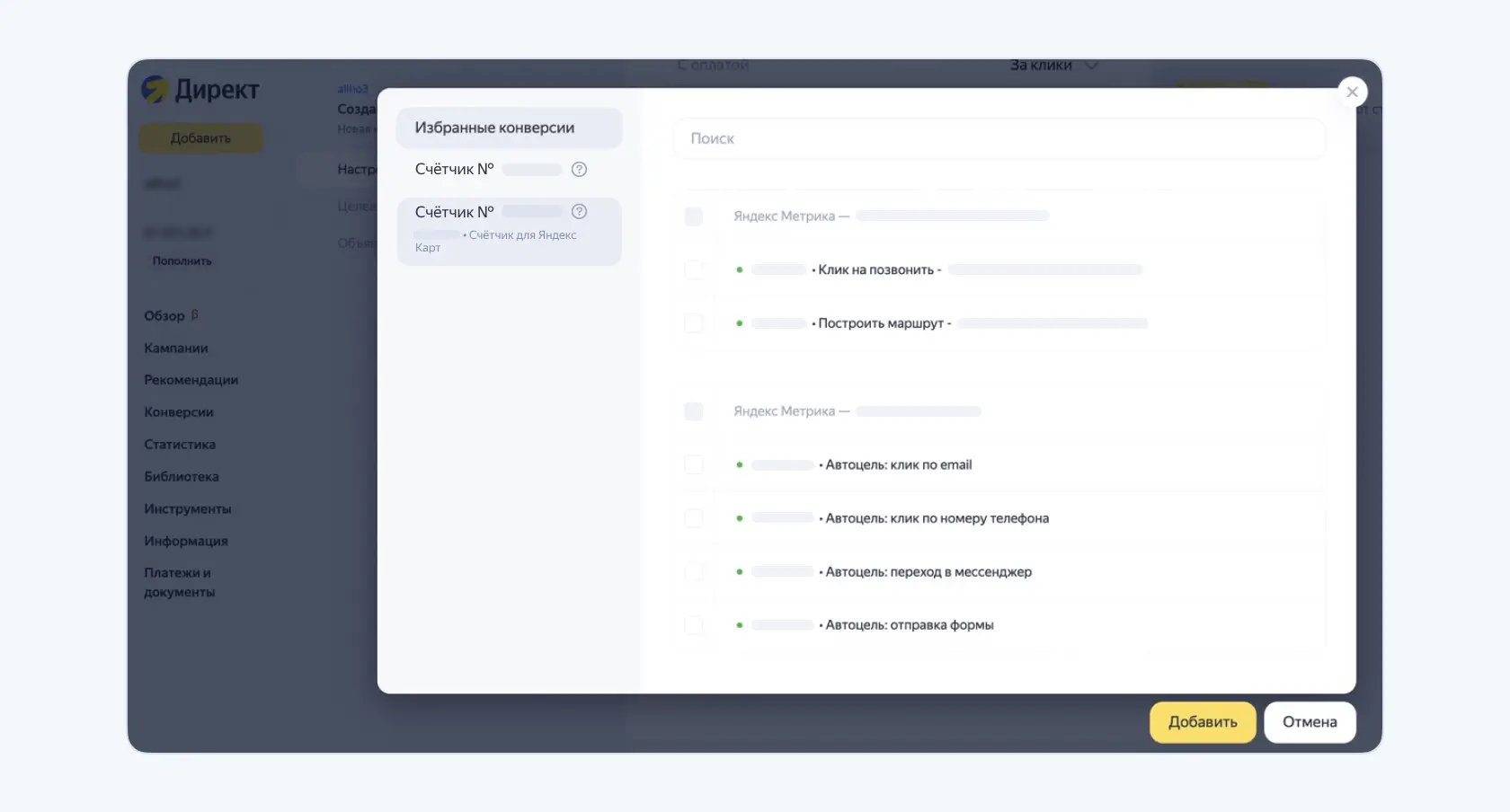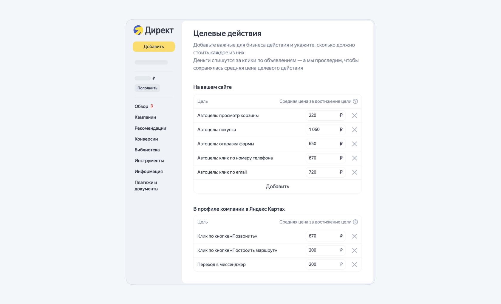 Эти цели помогут не только повысить эффективность рекламы, но и точнее оценить её эффективность. Так вы узнаете, сколько построенных маршрутов, потенциальных звонков или обращений через мессенджеры принесла карточка организации в Картах.