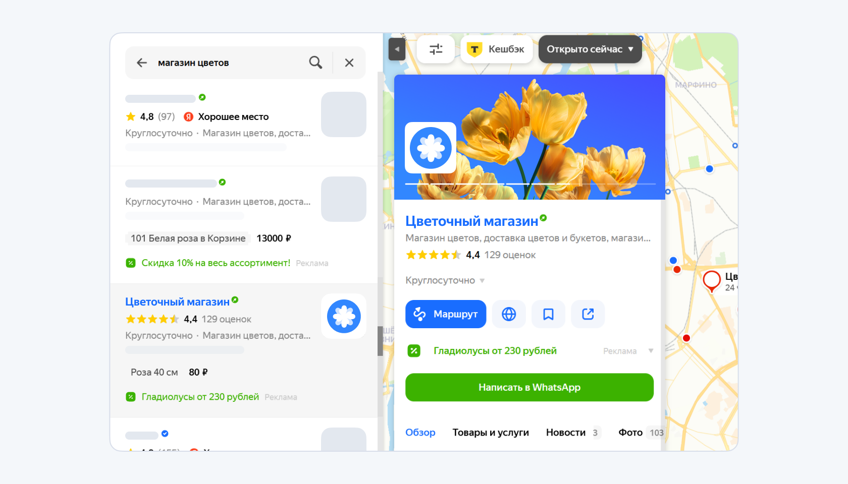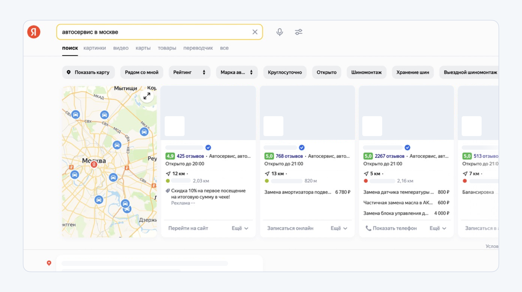 - Карточка будет показываться на более высоких позициях в поиске Карт. Так потенциальные клиенты, которые ищут товары или услуги рядом с вами, будут чаще видеть организацию и с большей вероятностью обратятся в неё — по телефону, в мессенджерах — или построят маршрут.