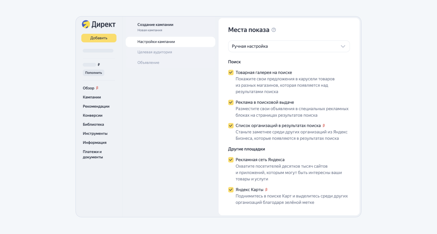 3. В блоке с местами показа добавились новые варианты — «Яндекс Карты» и «Список организаций в результатах поиска». Если карточка организации в Яндекс Бизнесе была предложена автоматически, по умолчанию будут включены все места показа: Поиск, Рекламная сеть и Карты. Если организацию добавить вручную, то места показа нужно будет выбрать самостоятельно с помощью ручной настройки.