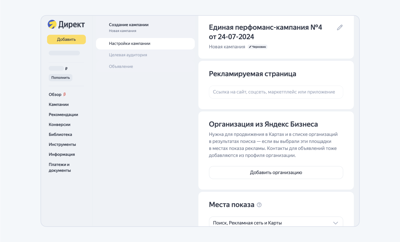 Затем вы сможете выбрать новые места показа и цели в Единой перфоманс-кампании или новые цели для карточки организации в Мастере кампаний. Это позволит рекламировать карточку в Картах, используя привычные настройки и стратегии Директа.