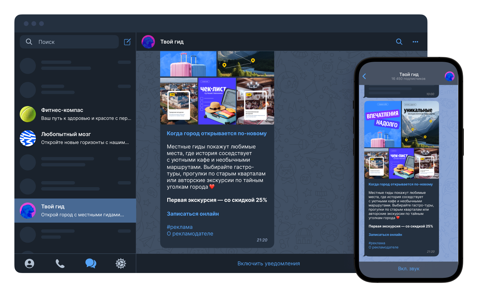 В начале бета-тестирования было около тысячи каналов, которые команда Рекламной сети Яндекса отбирала вручную. Уже на старте рекламное объявление выглядело как обычный пост: текст до 764 символов, изображение или видео и автоматическая маркировка. Рекламу видели все подписчики каналов, включая пользователей с Telegram Premium.
