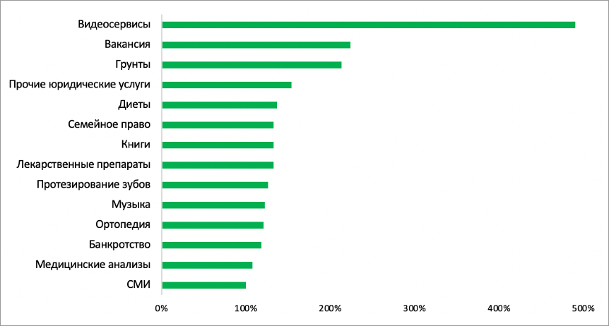 По нашим данным, по итогам первого квартала больше всего выросло количество кликов по рекламе компаний в категории «Видеосервисы»: