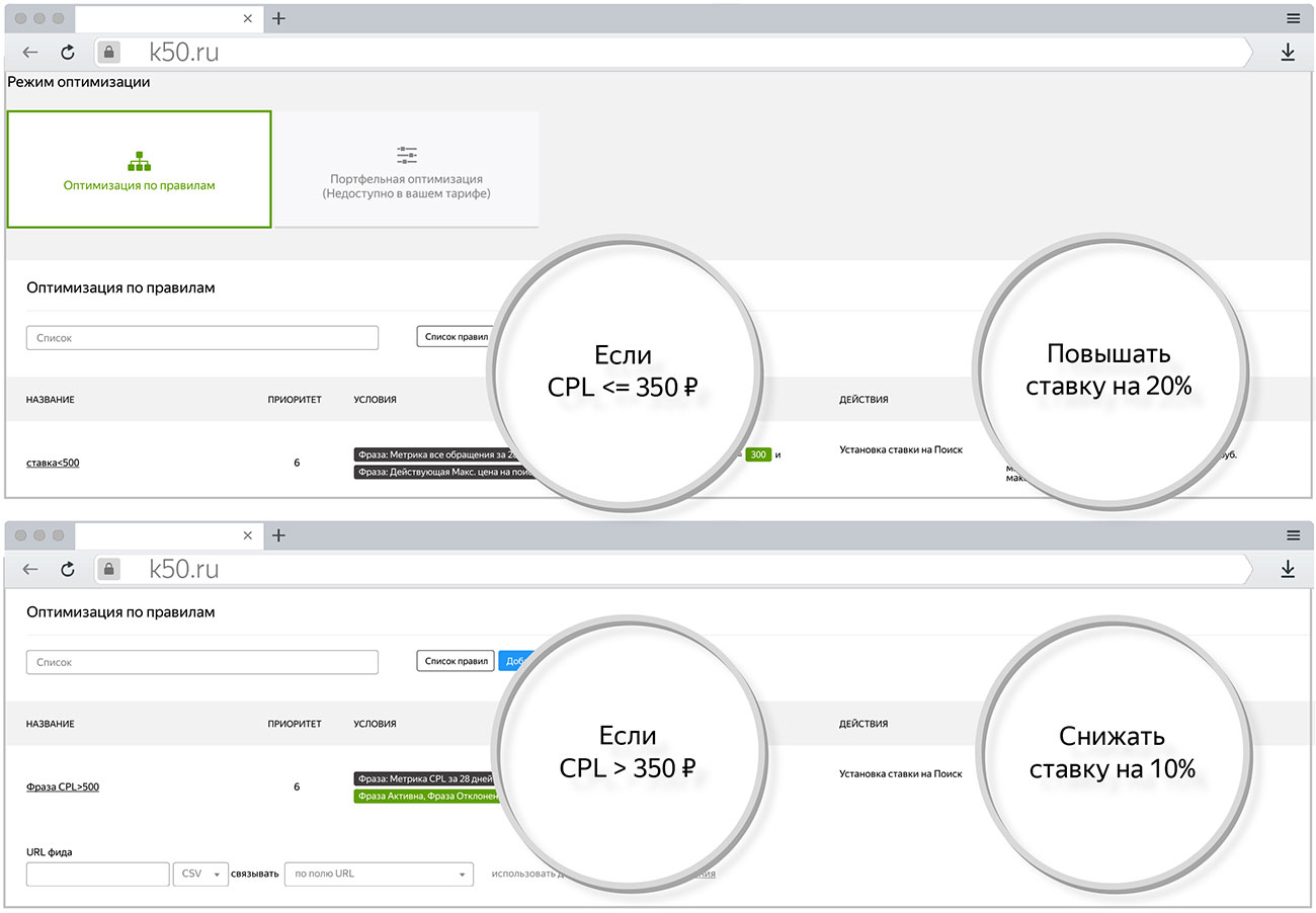 Настроили автоматическое управление ставками в K50. Каждую неделю ставки на фразы переназначались в зависимости от их CPL: если показатель меньше 350 ₽, то ставка повышалась, если больше 350 — снижалась.