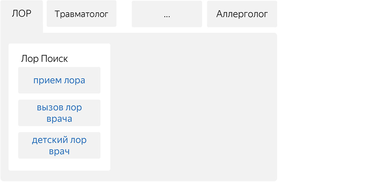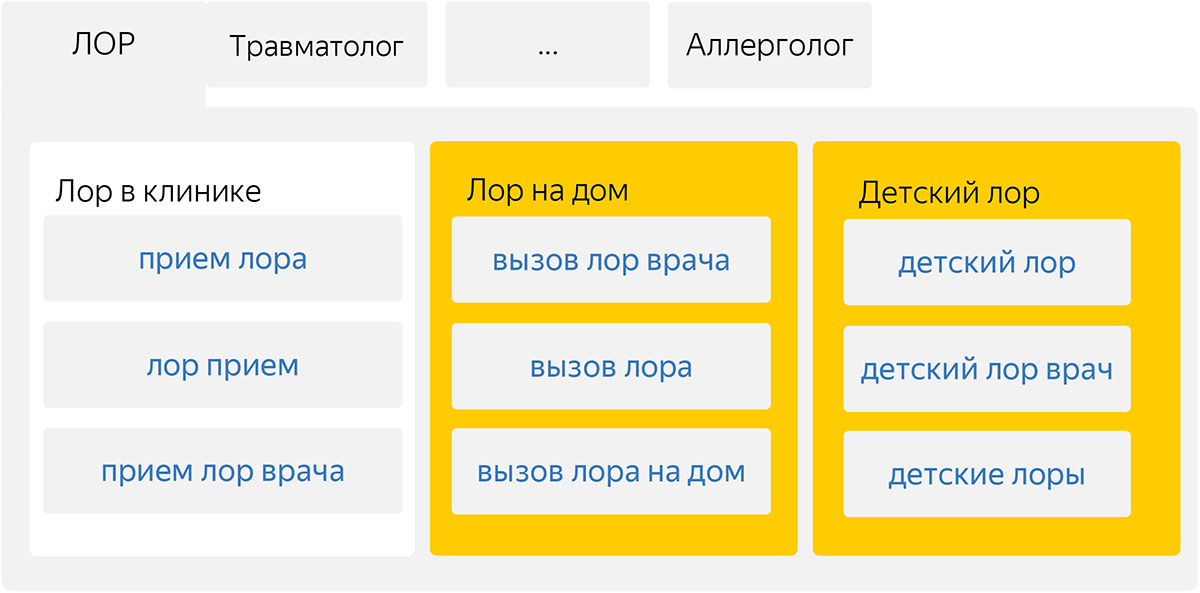 Например, раньше все запросы про отоларингологов вели на общий раздел сайта «ЛОР клиника». Теперь на направление работают три лендинга: детский врач, консультации специалиста и вызов на дом.