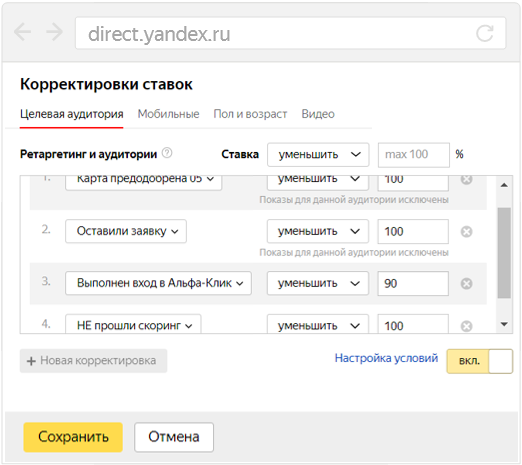 В Яндекс.Аудиториях на базе цели Метрики «идет скоринг» и «выполнен вход в интернет-банк» создали сегменты тех, кто уже оставил заявку или является клиентом. На базе обезличенных данных Банка создали сегменты «не прошли скоринг» и «карта предодобрена». Для них назначили понижающие корректировки ставок.