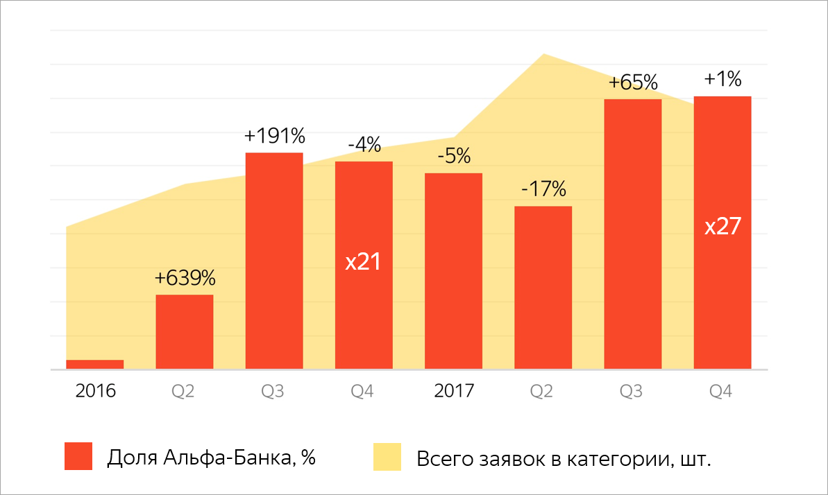 - Доля заявок Альфа-Банка в категории «кредитные карты» на Яндексе выросла в 27 раз.