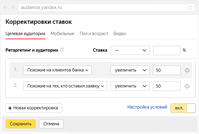 Повышающие корректировки на аудиторию сегмента look-alike
