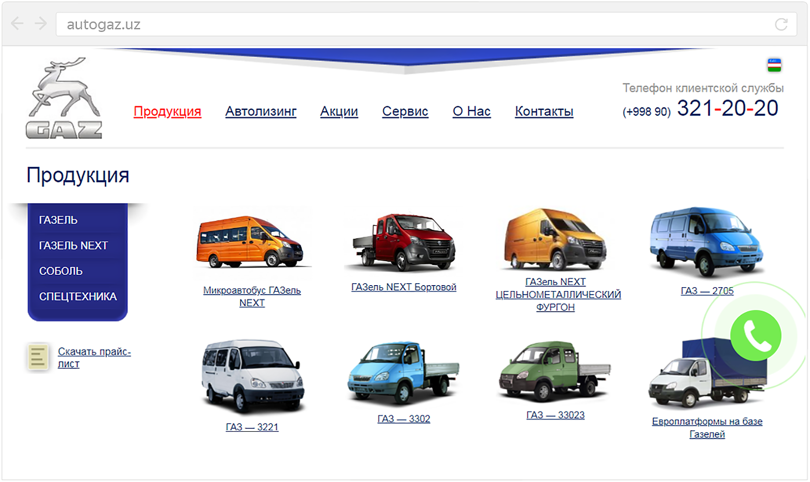 На сайте заинтересованный посетитель может посмотреть раздел «Контакты», скачать прайс на автомобили или оставить заявку на обратный звонок.