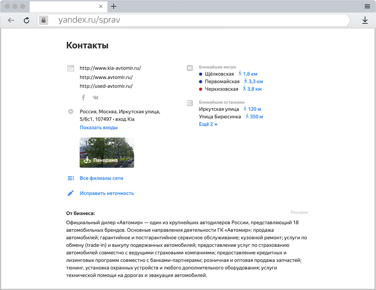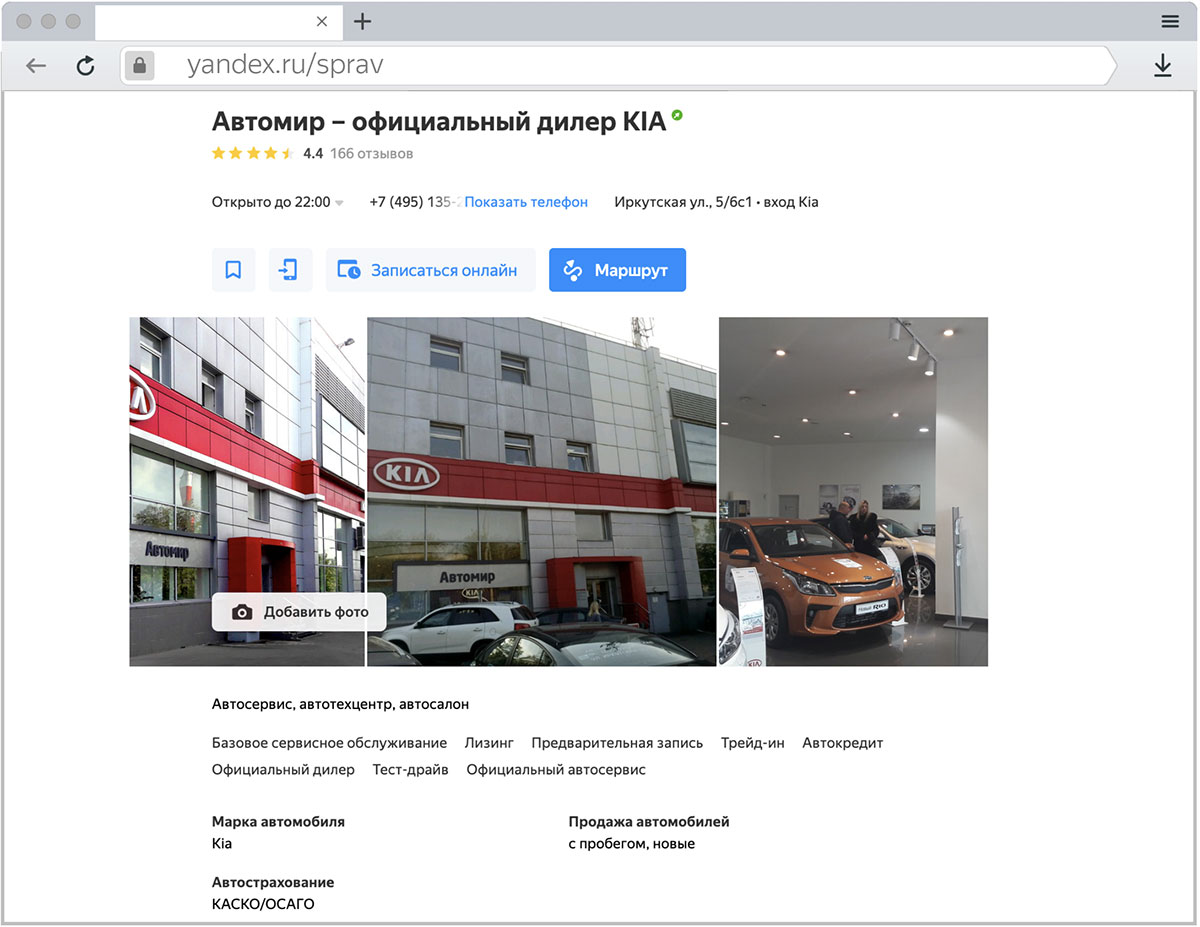 Привели все карточки к единому стилю: корректное название центра, сокращённое и полное — с брендом вендора, названием группы компаний и локацией. Добавили фотографии и полный список услуг в каждом центре: покупка автомобиля, слесарный сервис и страхование. Теперь потенциальный клиент сразу получает полное представление о доступных услугах в конкретном дилерском центре.