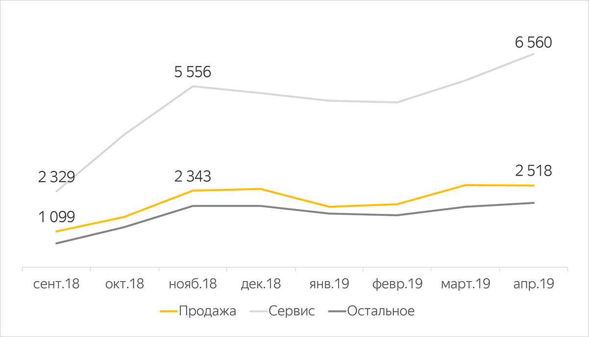 По фиду подключили колл-трекинг — к каждой карточке дилерского центра на Картах привязали подменный номер. Настроили систему колл-скоринга: все звонки, поступающие через рекламные каналы, тегировались по типу обращения: сервис, продажи, продажи юр. лицам, запчасти, доп. оборудование, авто с пробегом, страхование. Ещё убедились, что звонят в основном новые клиенты.