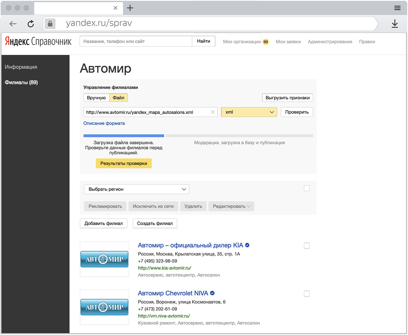 Подготовили специальный фид и загрузили его в личный кабинет Яндекс.Карт. Сотрудники Яндекса нашли, проверили и удалили дубли организации. Получили 87 карточек.