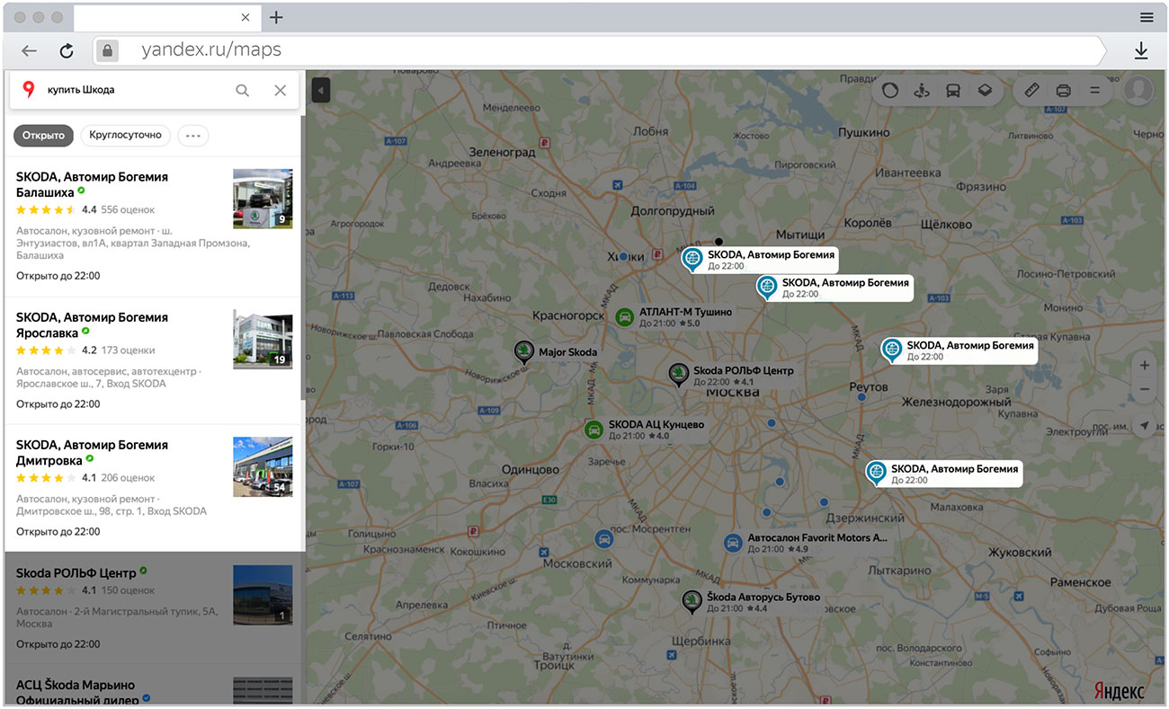 С сентября 2018 г. автомобильный дилер Автомир стандартизировал вид карточек всех дилерских центров на Яндекс.Картах: прописали корректные названия, сокращённое и полное, добавили фотографии и список доступных услуг в каждом центре. Отдачу отслеживали через колл-трекинг — к каждой карточке дилерского центра на Картах привязали подменный номер. Сначала для всех ДЦ заказали приоритетное размещение на Картах — с зеленой меткой, и уже в первый месяц получили 4 тысячи целевых звонков продолжительнее 50 секунд. Поэтому формат размещения улучшили до брендированного приоритетного размещения — метки с логотипом компании на карте. Всего за период получили 16 258 звонков в отдел продаж, 39 809 звонков в сервис, а стоимость обращения снизилась с 56 ₽ в среднем за сентябрь до 32 ₽ за апрель. До 80% обращений Карт — это звонки новых клиентов.