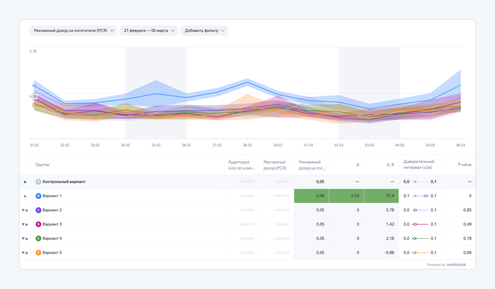 Затем запустили A/B-тест в Метрике с помощью технологии Varioqub. Трафик поделили поровну между блоками.