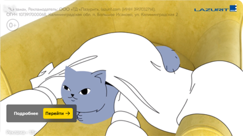Вместе с анимационной студией компания подготовила ролики на 30 и 15 секунд про кота Пуфика, его семью и то, как «Лазурит Мебель» делает их жизнь комфортнее.
