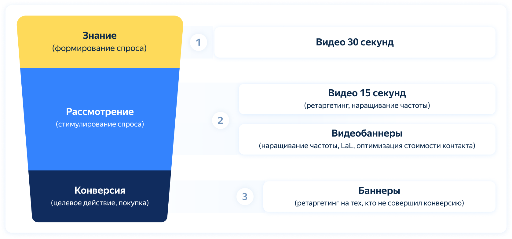 В рамках этой кампании с аудиторией работали на разных этапах воронки и доводили пользователей до покупки с помощью подхода, который был направлен на увеличение контактов и продолжение коммуникации: