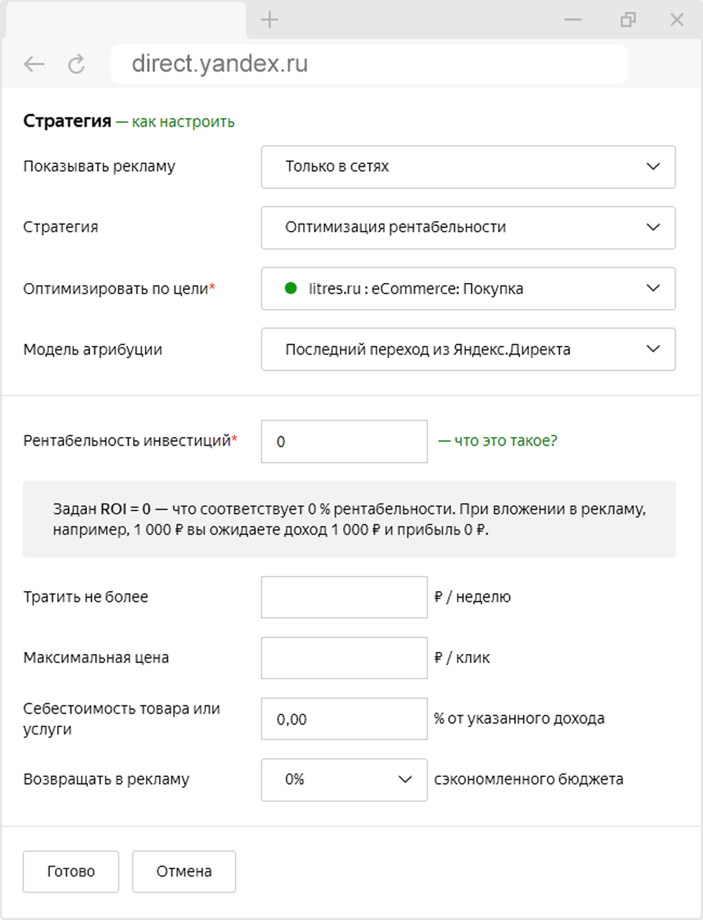 «Оптимизация конверсий» умеет работать по одной цели, по составной цели в Метрике и по ключевым целям. «Оптимизация рентабельности» тоже работает по всем ключевым целям — с ней можно задать коэффициент рентабельности и запустить рекламу без указания недельного бюджета. Вот тут подробный разбор работы конверсионных стратегий и советы по расчёту цены и рентабельности.