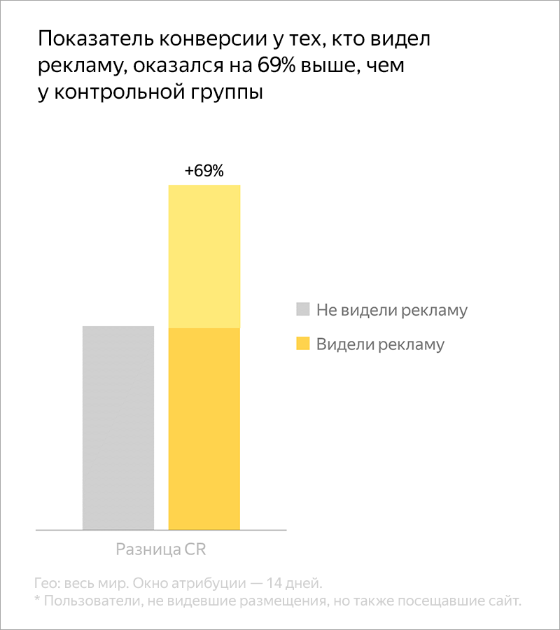Спустя 4 месяца подвели итоги: показатели посетителей сайт, видевших размещение, сравнили с контрольной группой — пользователями с аналогичными характеристиками, которым рекламу не показывали.