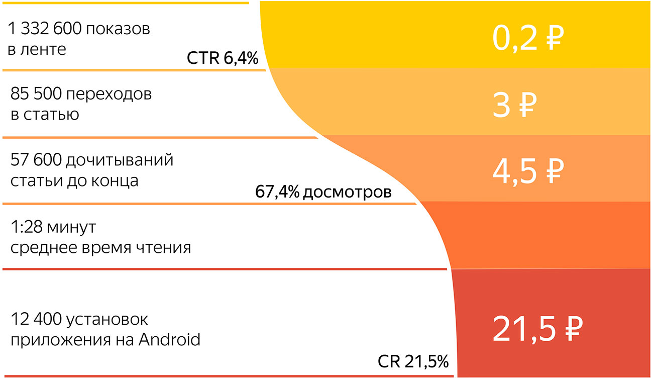 Карточка статьи получила более 1,3 млн показов. CTR — 6,4%, 85,5 тысяч уникальных пользователей кликнули по публикации в ленте и открыли статью. Из них больше 57 тысяч дочитали до конца, среднее время чтения составило полторы минуты. В результате кампания принесла 12 400 установок приложения МТС ТВ на Android после нативного перехода из статьи. Итоговая стоимость установки приложения составила всего 21,5 ₽.