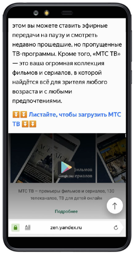 На фоне отключения аналогового телевещания в России МТС ТВ запустили рекламную кампанию по продвижению приложения для просмотра телеканалов, фильмов и сериалов. Цель кампании — рост знаний об МТС как о поставщике цифровых сервисов и установки мобильного приложения. Для решения задачи компания опубликовала в Яндекс.Дзене статью с технологией Scroll2site — нативным переходом в стор МТС ТВ в конце материала. В результате за неделю карточка статьи получила 1,3 миллиона показов, 85,5 тысяч уникальных пользователей кликнули по публикации в ленте, 57,6 тысяч дочитали до конца. Компания получила 12 400 установок приложения на Android, итоговая стоимость установки составила всего 21,5 ₽.