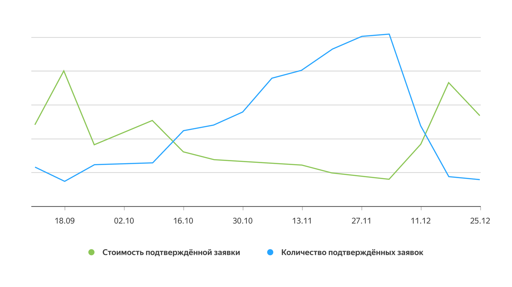Сравнили стоимость и количество подтверждённых заявок в период оптимизации (сентябрь — декабрь 2023 года) с периодом до запуска (май — август 2023 года).