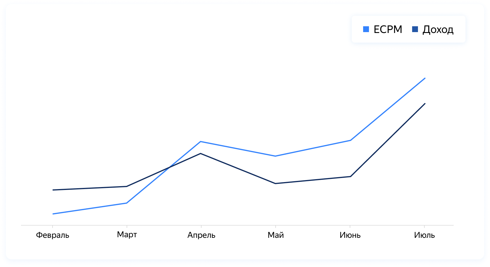 Динамика дохода и показателя ECPM после подключения Простой монетизации