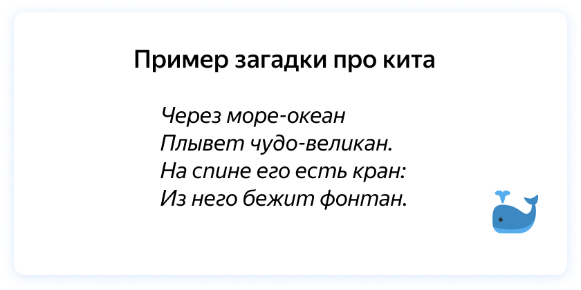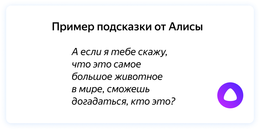 Графические блоки, которые появляются в диалоговом окне на устройствах с экранами после определенных активационных фраз. Например, после приветственного сообщения «Чем я могу помочь?» в чате с Алисой отображалось предложение поиграть с Барни.