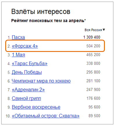Из рейтинга взлётов апреля (в него попадают все запросы, интерес к которым сильно вырос за месяц) видно, что помимо праздников внимание пользователей привлекают ещё и премьеры кинофильмов. Наибольший интерес среди новинок кино вызывал фильм "Форсаж 4".