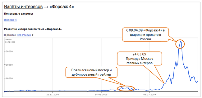 Первый пик в начале февраля, второй -- в конце марта, и третий, самый большой, -- в апреле. Апрельский пик понятен -- российская премьера состоялась 9 апреля и в эти же числа (9-12 апреля) Яндексу задали максимальное количество запросов на тему "Форсаж 4". Но что же вызвало всплеск интереса в марте и феврале?