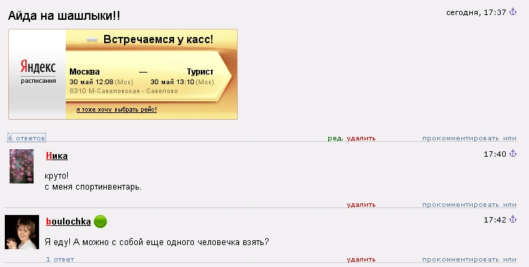А еще информер поможет организовать совместную поездку – пригласите друзей и сообщите, откуда и во сколько вы отправляетесь в путь. Например, вот так мы собирались на шашлыки: