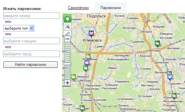 Фильтры слева позволяют ограничивать количество показываемых поездов по городу, станции или номеру поезда; а количество показываемых поездов зависит от выбранного масштаба. Чем подробней масштаб, тем больше поездов в регионе вы можете увидеть.
