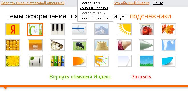 P.S. Вы всегда можете вернуть «Обычный Яндекс», а также подобрать другие весенние и летние темы под настроение или установить самую популярную на данный момент «тему погоды» с настоящим градусником и настоящими осадками.