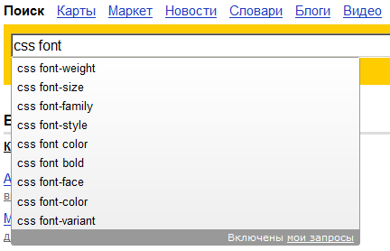 В некоторых случаях вы можете воспользоваться «поиском для программистов» даже не задавая запрос. Например, если вам нужно уточнить, какие дочерние свойства бывают у font в CSS, просто наберите css font в строке поиска ― в саджесте будут перечислены все возможные варианты, согласно CSS Reference с W3Schools.