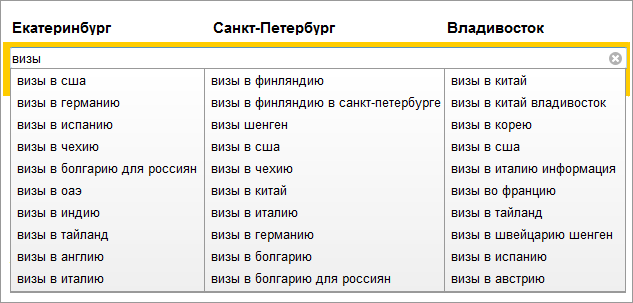 Подсказки в поиске Яндекса стали полностью локальными для 83 регионов России. Наиболее популярные локальные запросы и раньше дополняли список подсказок. Но теперь весь список для каждого региона строится в первую очередь на основе местных запросов. Так что подсказки полностью учитывают особенности интересов людей в разных городах и позволяют наглядно их сравнить.