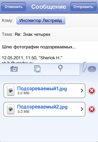 А ещё Яндекс.Почта для iPhone умеет фотографировать и узнавать, где вы (конечно, только с вашего согласия). Представьте: вы хотите посоветоваться, какого цвета рубашку купить, а в магазин пошли в одиночестве. Не проблема! Сделайте несколько снимков прямо в примерочной и отправьте их другу или подруге, чей вкус авторитетен для вас. Если вдруг пакетов с покупками будет много, а вы без машины — тоже не проблема. Вы сможете одним кликом добавить ссылку на своё местоположение прямо в письмо и отправить его знакомому автомобилисту. И пока ждёте помощи — скоротайте время, болтая в чате, который тоже есть в нашем приложении.