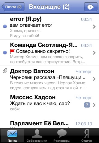 Скачать Яндекс.Почту для iPhone можно из AppStore, отправив себе SMS или зайдя с мобильного на сайт m.ya.ru/ymail.
