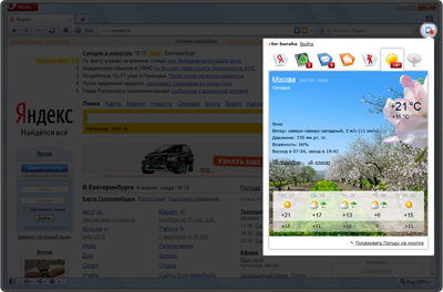 Новая Opera включает в себя Яндекс.Бар и поиск Яндекса. Нажав на значок Яндекс.Бара на панели, вы увидите всплывающее окно, в котором размещаются вкладки сервисов Яндекса. По умолчанию на кнопке указано количество новых писем в Яндекс.Почте, но при желании можно настроить отображение Пробок, Погоды или другого сервиса Яндекса.