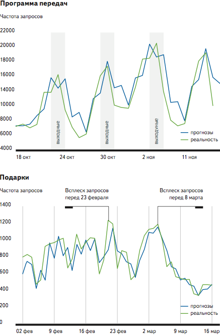 Обработав таким образом все подсказки, мы понимаем, насколько каждая из них может быть востребована завтра. И на следующий день Яндекс ранжирует подсказки в соответствии с их прогнозируемой частотой употребления. О точности прогнозов можно судить, сравнив предположения с реальными запросами пользователей. Например, вот так выглядят кривые предсказания и реальности по запросам [программа передач] и [подарки]: