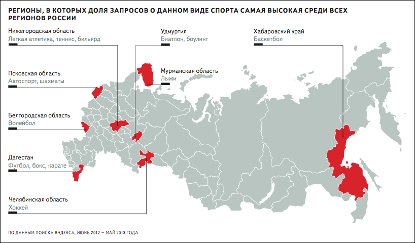 Интерактивную карту региональной популярности отдельных видов спорта смотрите на странице исследования.