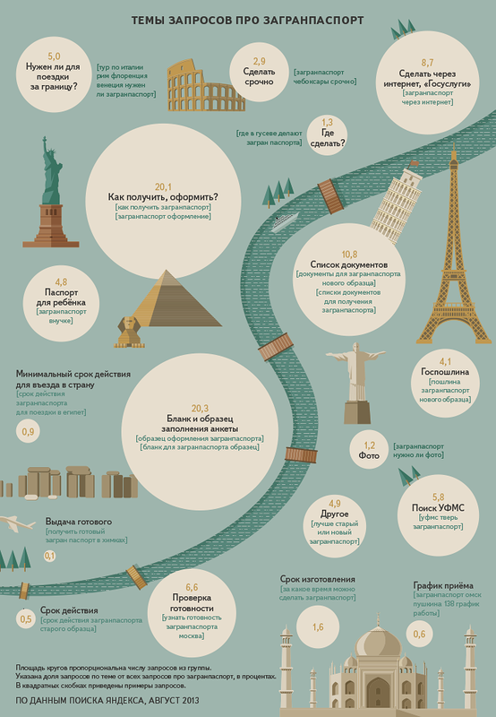 Около 20 процентов всех запросов про загранпаспорт — это разные вариации самого главного вопроса: как оформить этот документ. Двадцать процентов касаются анкеты — пользователи ищут шаблон и образцы заполнения. Кроме того, ищут список необходимых документов (11 процентов), способ подать заявление через интернет с помощью портала «Госуслуги» (девять процентов), возможность проверить готовность паспорта через сеть (семь процентов).