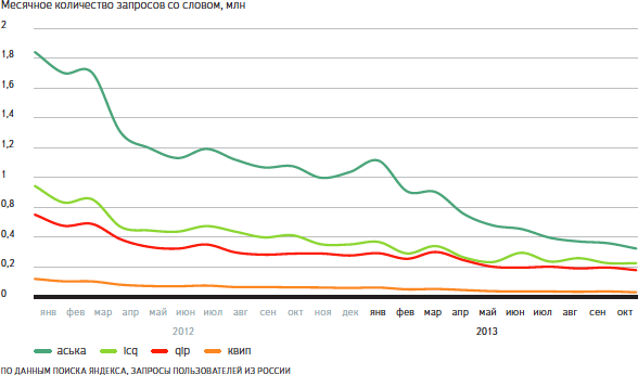 Популярные темы и связанные с ними запросы уходят из поиска ещё медленнее, чем появляются. Тем не менее, есть целый ряд явлений, интерес к которым неуклонно сокращается. В основном это устаревающие технологии и сайты. К примеру, второй год продолжается падение интереса к некогда суперпопулярному мессенджеру ICQ.
