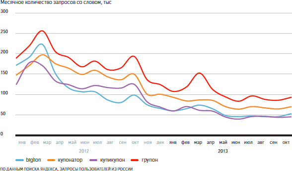 Продолжает падать интерес пользователей к Nokia и Ericsson. Вместе с ними исчезает интерес и к сопутствующим брендам, таким как Ovi и Xpressmusic, а также мобильной платформе Symbian. В теме интернет-сервисов можно говорить о завершении бума купонных сайтов. С начала 2012 года вдвое меньше стало запросов про Biglion, Групон, Купикупон и Купонатор.