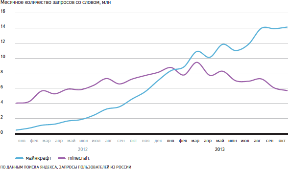 Главное слово 2013 года — это название игровой вселенной Майнкрафт, причём именно на русском, а не на английском языке. За первые десять месяцев этого года количество запросов с этим словом выросло почти вдвое. Это рекордный результат, если учесть, что число запросов росло не от нуля, а от уже внушительной цифры в 8 миллионов запросов в месяц.