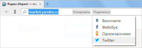 Еще одна новинка — ссылка «Поделиться» в адресной строке. Она позволяет в несколько кликов отправить другим то, что понравилось самому. Вы можете делиться с друзьями в Фейсбуке, Твиттере, ВКонтакте и Одноклассниках. А если вы хотите разместить адрес странички где-нибудь ещё, рядом с «Поделиться» есть ссылка «Копировать». Она как раз для такого случая. (Обе ссылки доступны в версии для Windows.)