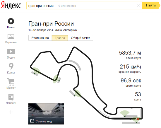 Это настоящий спецпроект внутри поиска. По запросам вроде [формула-1 сочи] или [гран-при россии] вы увидите в поисковой выдаче интерактивный ответ, который позволит изучить трассу, проверить расписание заездов или узнать результаты квалификации. Запросы с названиями команд или именами гонщиков покажут объектный ответ — карточку пилота или команды с небольшой справкой о них.