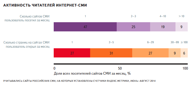 Оказалось, что каждый четвёртый пользователь интернета в России читает новости хотя бы раз в месяц. Почти половина из них пользуется только одним источником, ещё четверть читает новости на двух-трёх сайтах. Что касается активности, то 58% читателей новостей в месяц просматривают не более пяти страниц на сайтах СМИ. Доля тех, кто просматривает 30 и более страниц в месяц, то есть посещает новостные сайты более-менее регулярно, составляет 15% (это 4% всех российских пользователей интернета).