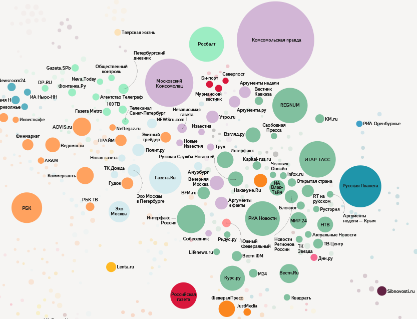 На основе данных об аудитории мы составили большую интерактивную карту российских интернет-СМИ — с её помощью вы можете получить представление о количестве публикаций разных изданий и о сходстве аудитории разных СМИ (по клику на изображение откроется полная версия карты).